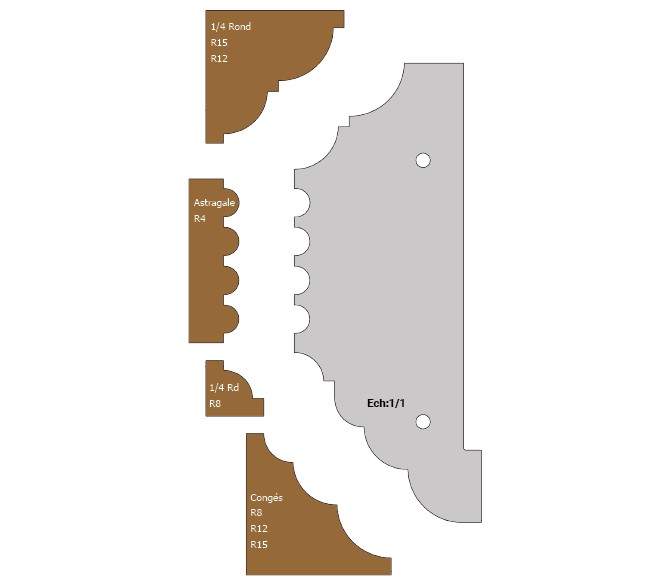 Jeu de 2 lames UGH Astragale R4 + 1/4 de rond R8-12-15 + Congés R8-12-15